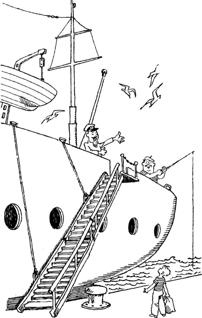 Он должен был подойти к судну на катере, и Солнышкин привязывал к борту красивый капитанский штормтрап. Он завязал его уже на один узел, как вдруг за спиной раздался знакомый возглас:
