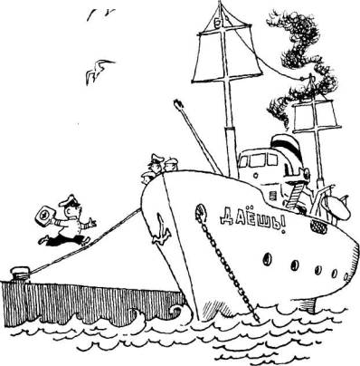 Наступил день отплытия. Пароход «Даёшь!» торжественно вывели на рейд. Солнышкин стоял на вахте у трапа и всматривался в берег. Там махали платочками женщины, инспекторы носились с бумагами, а Моряков получал на берегу последние документы и особо важные распоряжения.