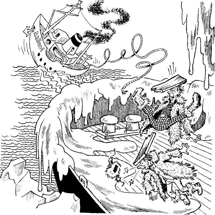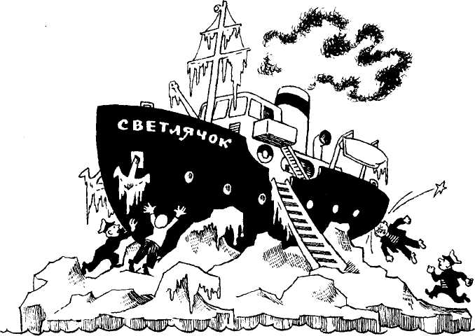 Мачты «Светлячка» шевельнулись, лёд на нём тоже дрогнул, раскололся, как скорлупа, — и маленький весёлый пароход, словно встряхнувшись, закачался на чистой воде. Шахматное поле, по которому на четвереньках полз получивший неожиданный мат Плавали-Знаем и прыгал Уточка, разлетелось на клетки.
