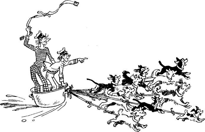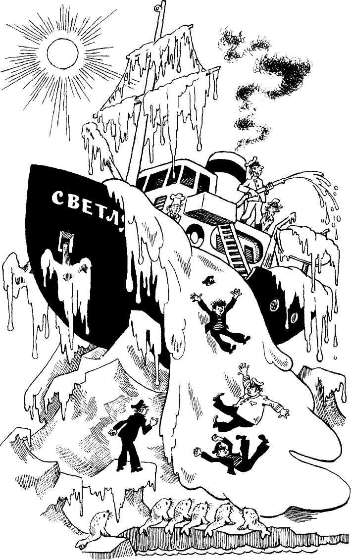 Но что касается «циркового номера», то он действительно получился. От взрыва, от рассыпанной соли, от собачьего лая суда качнулись, протянутый Солнышкиным трос ударил снизу по надрезанной Барьерчиком льдине, и, расколовшись пополам, она пошла дробиться на части.