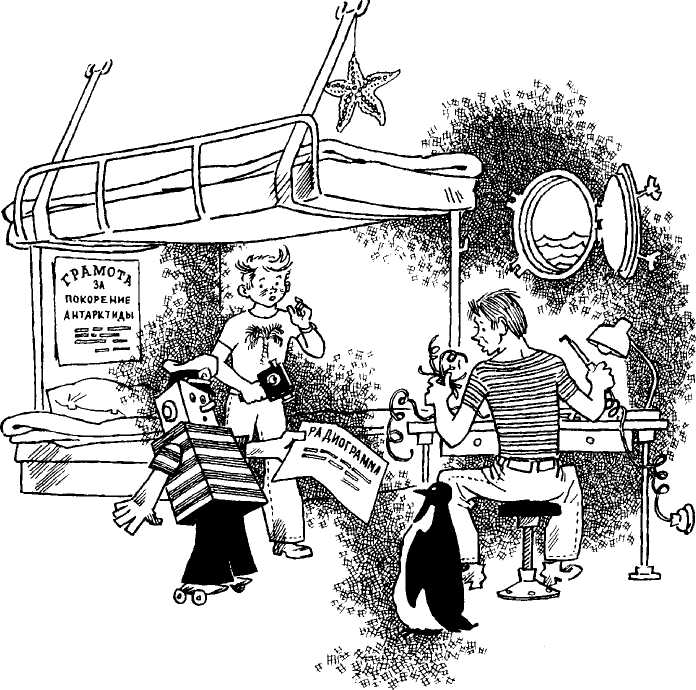 «Даёшь!», как известно, качался с Солнышкиным и Перчиковым у берегов Антарктиды, а Плавали-Знаем, подсчитывая выговоры, прогуливался по набережным Океанска. Правда, на какое-то время он забыл свою поговорку и даже согласился с тем, что кое-куда он не плавал, а кое-чего не знал, и купил себе стопку учебников…