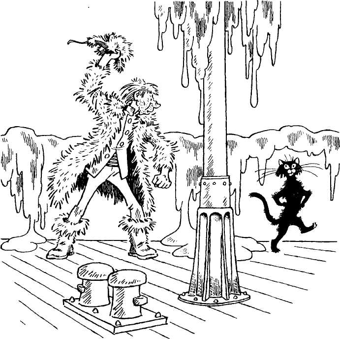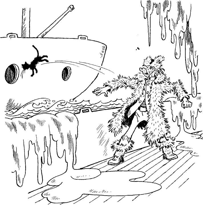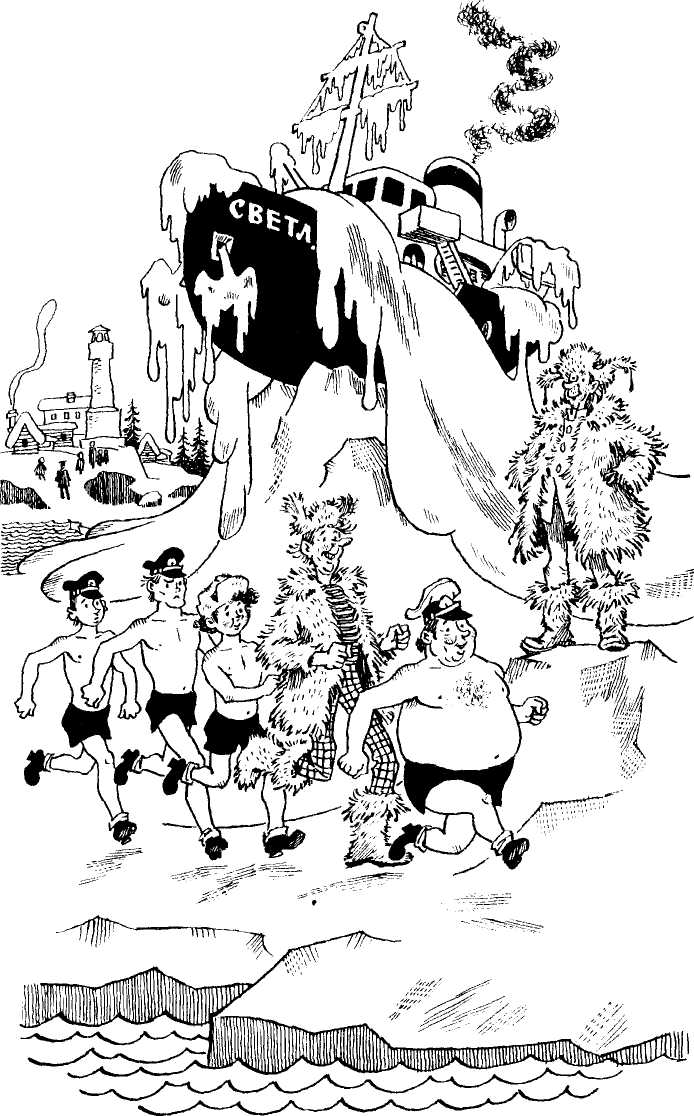 И, бросившись к борту, команда увидела, как, сидя на льдине и работая вёслами-руками, к «Даёшь!» гребёт невысокий человечек в нарисованной яркой тельняшке. Морячок догонял свою палубу.