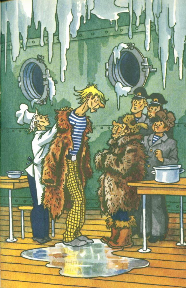 Это выбрались из кубрика закончивший песню начальник училища и Репортажик. Казалось, начальник дирижировал всем вокруг — и льдинами, и нерпами, и кораблями. Но, посмотрев на Солнышкина, он протянул руки и закричал: