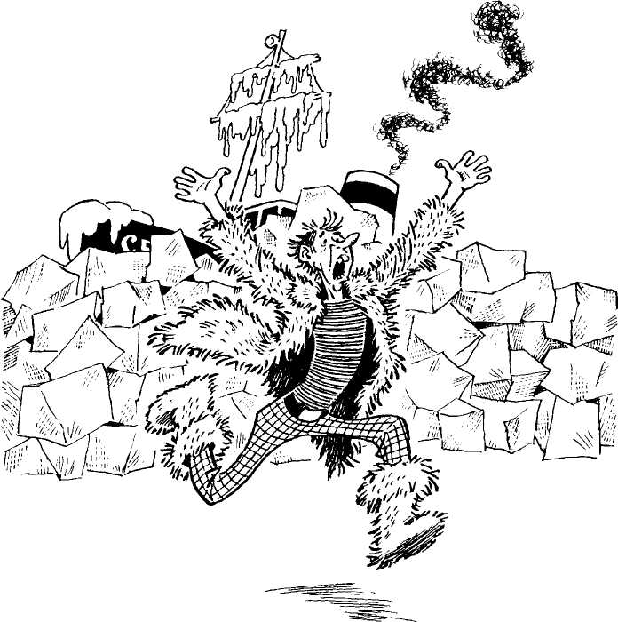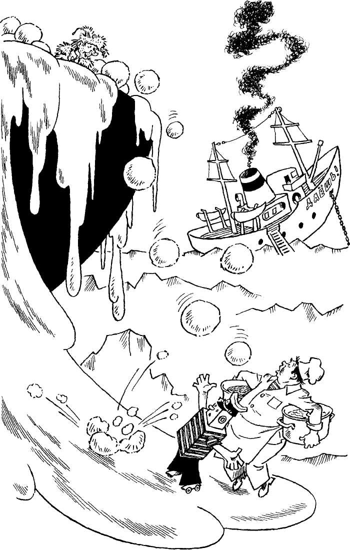 Пока предприимчивый Репортажик мчался в сторону радиоцентра в Океанске, у маленького острова Камбала неожиданно нахлынувший мороз действительно вытворял чудеса. Волны застывали мгновенно, как холодец на блюде, вмораживая в лёд беззаботный пароходец, по мостику которого бегал капитан и, свешиваясь через борт, кричал на корму: «Дружно!», а глядя на нос: «Взяли!»